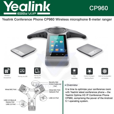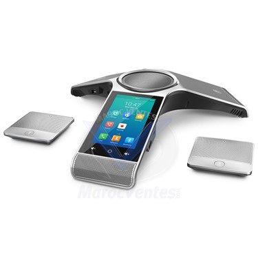 - 2 microphones sans fil CPW90 inclus- Écran couleur tactile 5" 720x1280- Android 5.1- Bluetooth 4.0- WiFi 802.11.b / g / n / ac- Menus interactifs à l'écran- HD Audio (haute définition)- Haut-parleur duplex intégral- Acquisition vocale jusqu'à 6 mètres et 360 °- Annulation des échos- Conférence à 5- Prend en charge l'enregistrement USB- Codec de voix : G722, G722.1C, G726, G729, G723, iLBC, Opus- Technologie anti-bruit Yealink- 1 compte SIP- Attente, muet, DND, enregistrement, hotline- Répétition du dernier numéro, appel en attente, appel d'urgence- Réglage manuel ou automatique de la date- Connecteur jack 3,5 mm pour haut-parleur externe ou amplificateur- Jusqu'à 1000 entrées / contacts- Journal d'appels- Importation d'annuaire- Portes et connexions- 1 RJ45 LAN 10/100- WiFi 2.4 - 5 GHz- Bluetooth 4.0- Port LAN Power over Ethernet 802.3af classe 4- 2 ports de microphone avec fil- 2 ports USB 2.0- 1 prise de sortie audio 3,5 mm- 1 port USB 2.0 Micro-B- 1 emplacement de sécurité- Dimensions : 338 x 338 x 74 mm - Plus d'images (7)